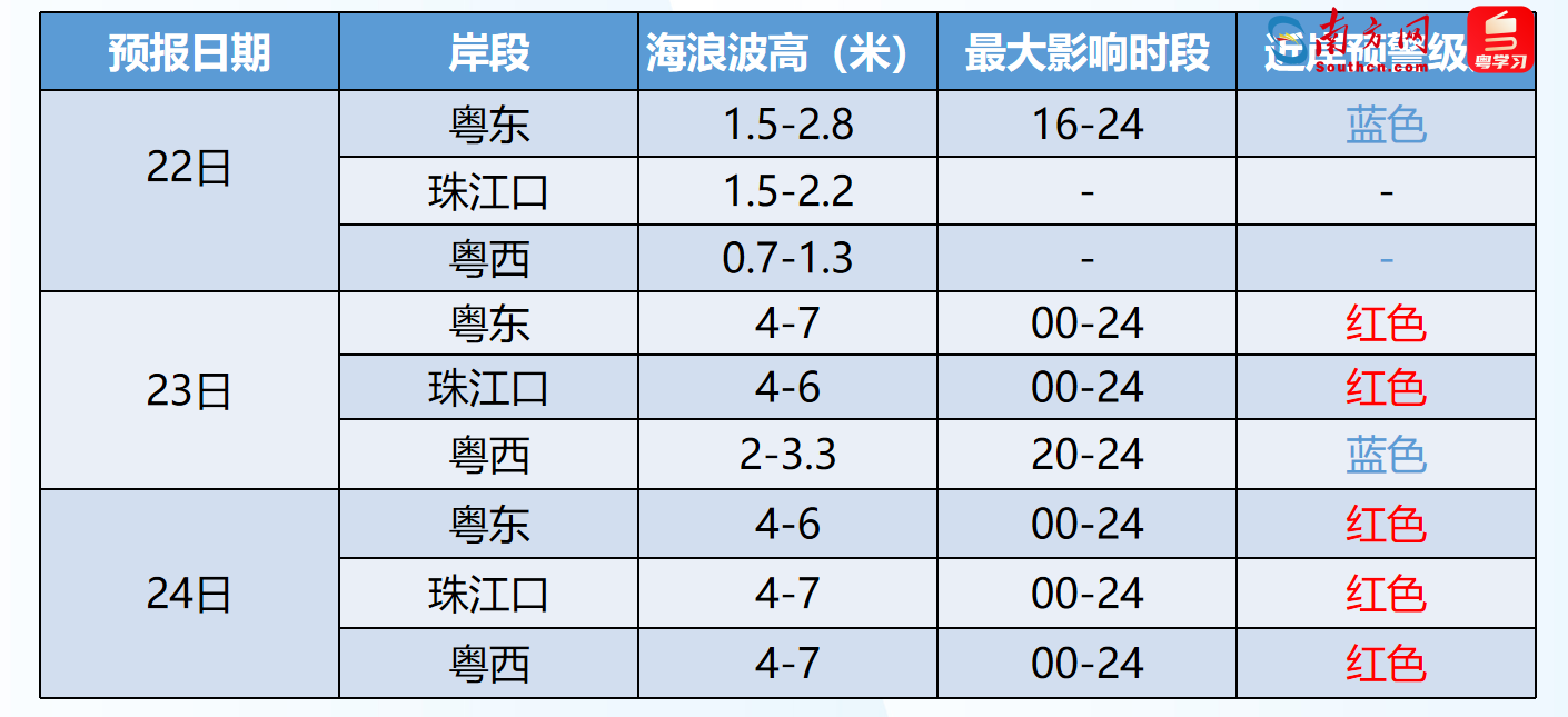 根據中央氣象臺預報路徑,受臺風(fēng)“樺加沙”影響,海低海水預計23-25日,洼地粵東沿岸將出現80-180cm的風(fēng)暴增水,其中潮州市、汕頭市、揭陽(yáng)市的預警級別為黃色,汕尾市的預警級別為橙色;珠江口沿岸將出現100-320cm的風(fēng)暴增水,其中惠州市、深圳市、東莞市、廣州市、中山市和珠海市的預警級別為紅色,江門(mén)市的預警級別為黃色;粵西沿岸將出現50-150cm的風(fēng)暴增水,其中陽(yáng)江市、茂名市的預警級別為黃色,湛江市的預警級別為藍色。